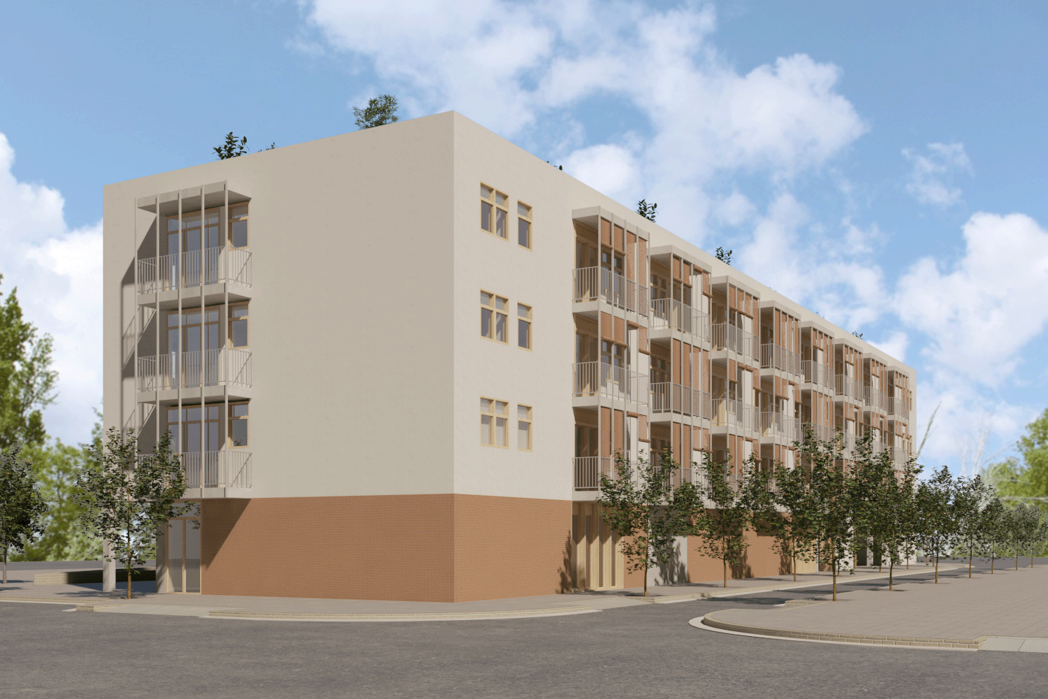 Promoció sobre sòl municipal cedit, obra nova. Edifici d’estructura de fusta i habitatges d’inclusió.