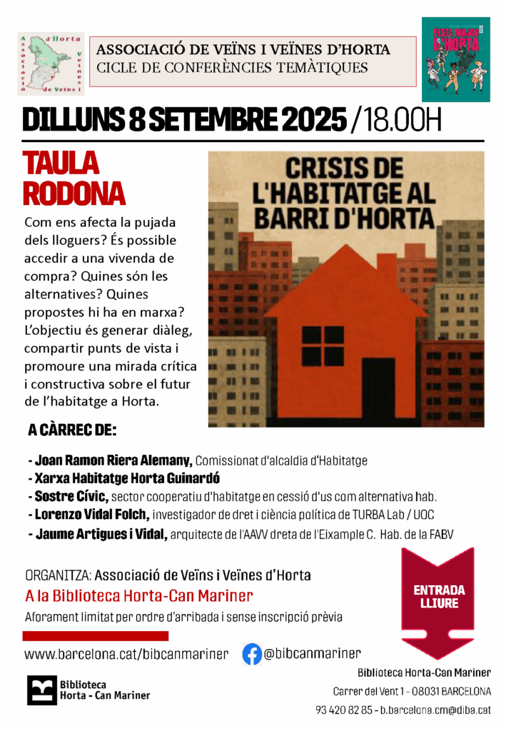 Com ens afecta la pujada dels lloguers? És possible accedir a una vivenda de compra? Quines són les alternatives? Quines propostes hi ha en marxa? L’objectiu és generar diàleg, compartir punts de vista i promoure una mirada crítica i constructiva sobre el futur de l’habitatge a Horta.
