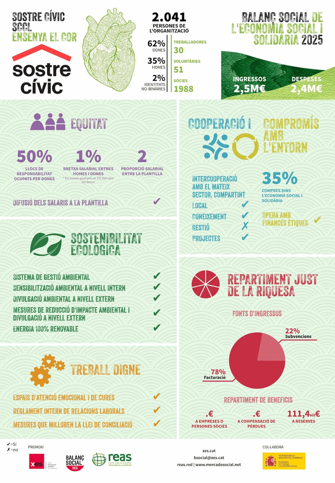 Tot plegat, aquest salt d’escala el fem mantenint l’equilibri econòmic: les dades econòmiques de tancament de 2024 (les darreres auditades i, per tant, presentades al Balanç Social) Sostre Cívic ha tingut ingressos per valor de 2,5 M€ i despeses de 2,4 M€, amb el 100% dels excedents destinats a reserves, coherent amb el nostre objecte social sense ànim de lucre. A més, un dels àmbits més ben valorats de l’informe és el d’economia i política de lucre, amb un resultat excel·lent i destacant la baixa dependència de subvencions (22% dels ingressos), i l’aposta clara per les finances ètiques, amb més del 90% dels recursos dipositats en entitats de banca ètica.