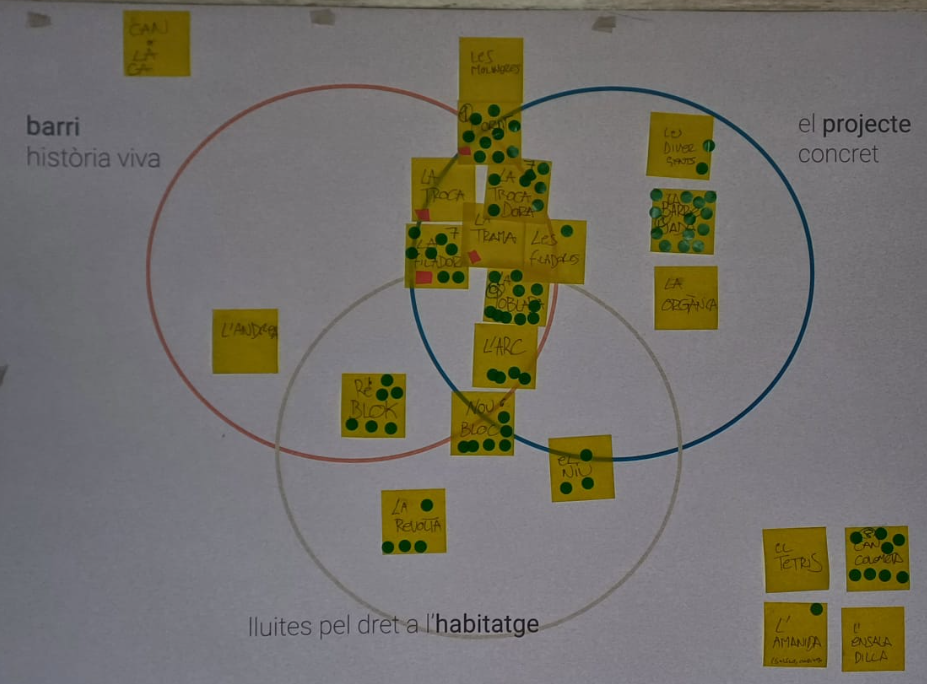 A partir de tres eixos —la història de Sant Andreu, els valors del projecte i la lluita pel dret a l’habitatge— van començar a generar idees sobre quins noms els podien representar millor. En van sortir molts, i molt diversos: La barrejada, La filadora, La trama, Reblok, Can Colometa, L’ensaladilla, La poblada… Podeu consultar la llista completa al final d’aquest article!